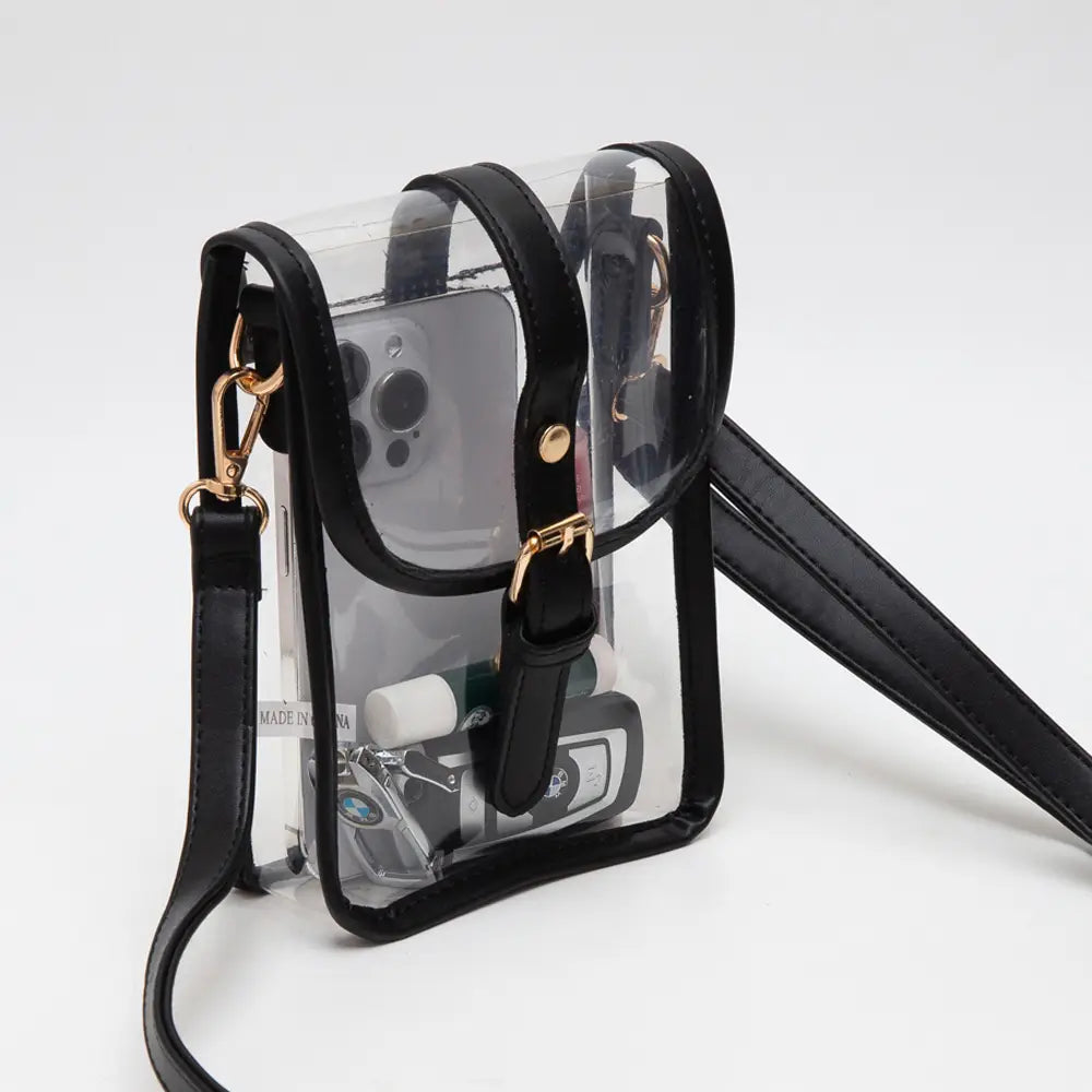 Size : 5" X 7" X 2" Strap Size : 50" L / Detachable, Adjustable Magnetic Closure Stay compliant and stylish with this clear crossbody satchel, designed with structured edges, gold-tone hardware, and an adjustable strap for comfortable wear. The transparent body with buckle detail offers easy visibility and secure storage—ideal for stadiums, concerts, and daily errands.