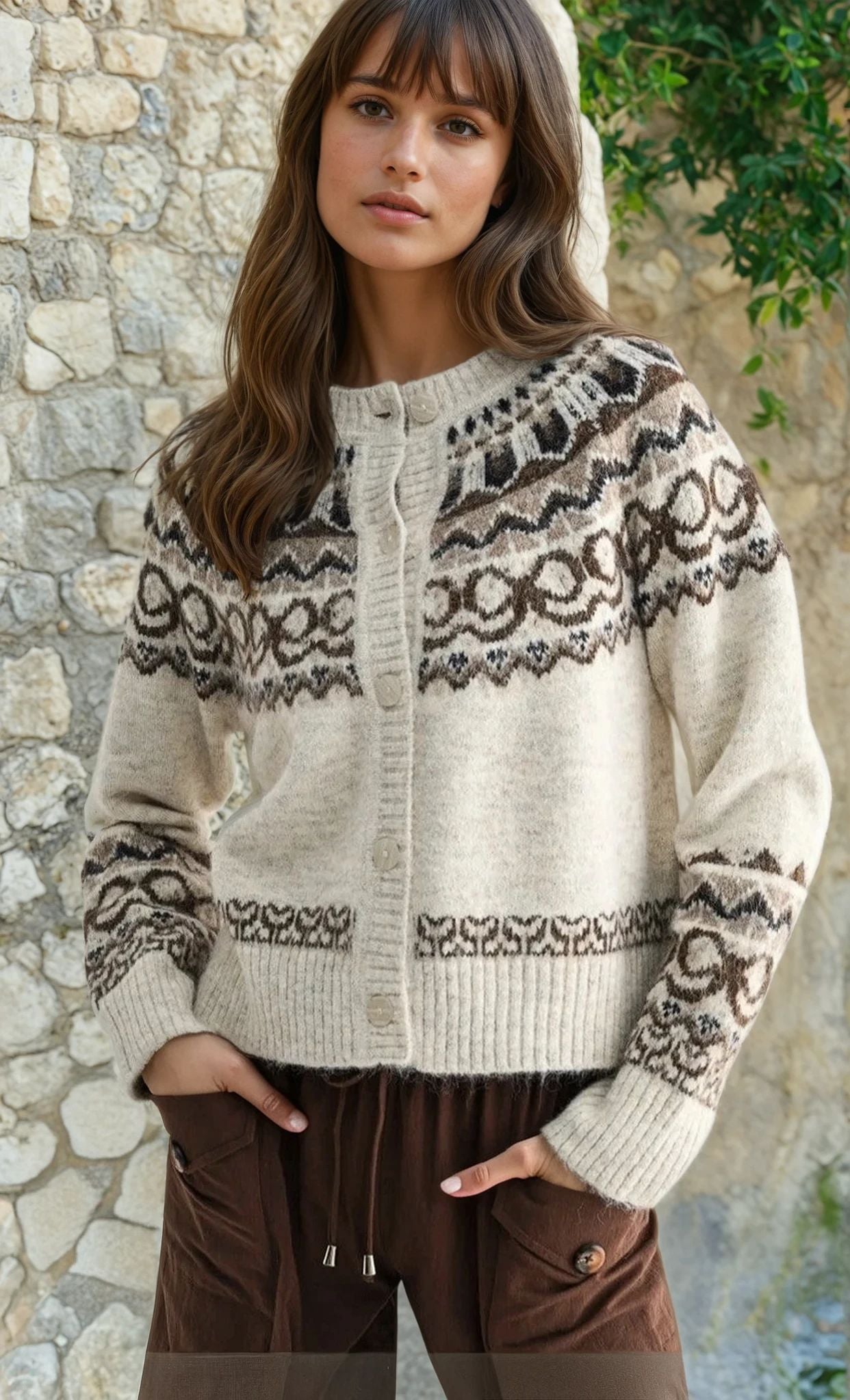 Elevate your wardrobe with this sophisticated wool-blend cardigan. Showcasing a refined Nordic-inspired pattern in neutral tones of oatmeal and brown, this cardigan combines timeless style with high-end construction.