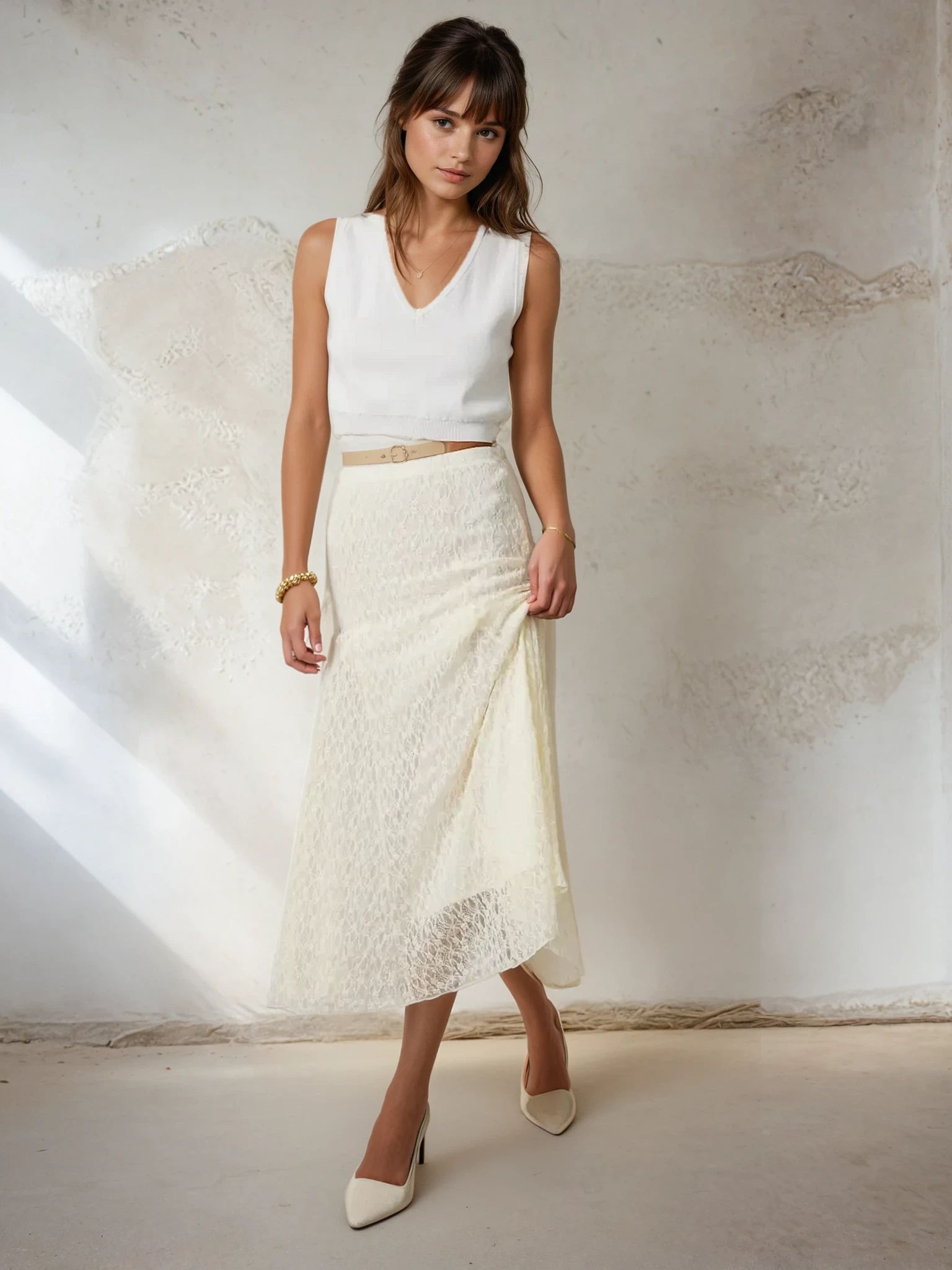 Twirl into elegance with the Laila Lace Maxi Skirt—a dreamy ivory number that's equal parts romantic and effortlessly chic. Delicate lace detailing creates an ethereal vibe, while the flowing maxi silhouette flatters every frame. Perfect for date nights, garden parties, or whenever you want to feel like the main character. Dress it up with heels and a blazer, or keep it casual with sneakers and a tee. This versatile piece is your new go-to for looking polished without trying too hard.