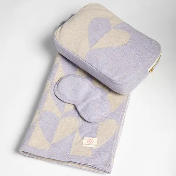 Oversized, split-heart graphics create a striking focal point in the Amore travel blanket set, blending charm with contemporary design. The coordinated blanket, eye mask, and pouch are crafted from ultra-soft fabric for a luxurious travel experience. Soft pastel tones enhance the playful heart motif, adding a sense of warmth and joy. Perfectly portable, this set is both stylish and comforting for journeys near or far.