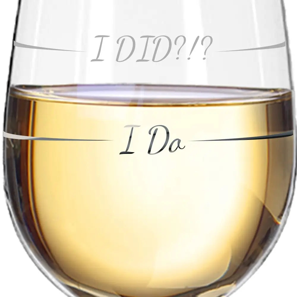 Celebrate your special day with the Stem Wine Glass | I Do / I Did?! This 16oz all-purpose glass, made in the USA, features playful “Perfect Pour” lines in white and shimmering platinum metallic ink to guide your 6oz and 10oz servings. Just a heads-up: to keep the platinum detail shining, please hand-wash only. Make your wedding reception unforgettable—for all the right reasons!
