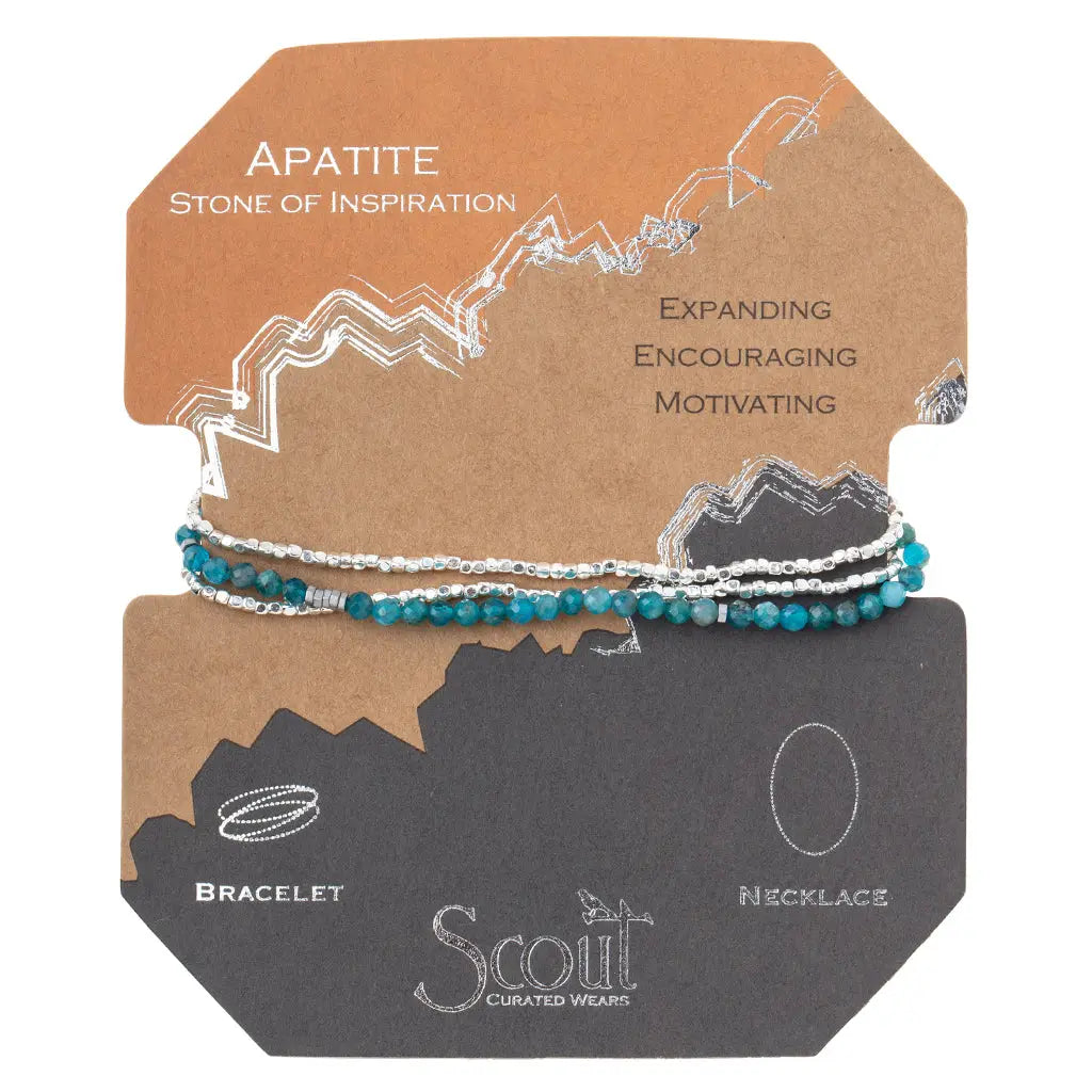 Bracelet becomes a necklace & Ta-Da! Faceted gemstones mix with tiny geometric metal beads to create a subtle and magical piece. Wraps as a bracelet 3 times or wear as a single strand necklace. • Materials: Semi precious gemstone beads, plated brass, stretch cord • Presented on cards that tell the meaning and properties of each stone. • Apatite: Stone of Inspiration. Expanding, Encouraging, Motivating.