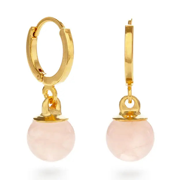 Rose quartz orbs meet timeless elegance in these delicate drop earrings. Crafted with 8mm rose quartz spheres that glow in soft pink tones, they're believed to channel love and healing energy wherever you go. Suspended from 14mm gold-plated brass hoops, these beauties are lead and nickel-free for worry-free wear. Perfect for adding a touch of sparkle and intention to your everyday style.