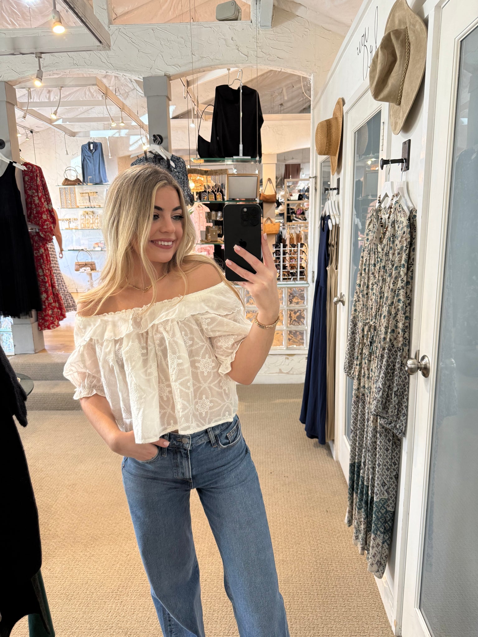 Off-white never looked so charming. This embroidered babydoll blouse flirts with off-the-shoulder elegance, letting you show just enough skin to keep things interesting. Delicate embroidery details add texture and personality, while the relaxed silhouette keeps you comfortable all day long. Perfect for date night, brunch with friends, or whenever you want to feel effortlessly cute. Pair it with your favorite jeans or a flowy skirt and watch heads turn.