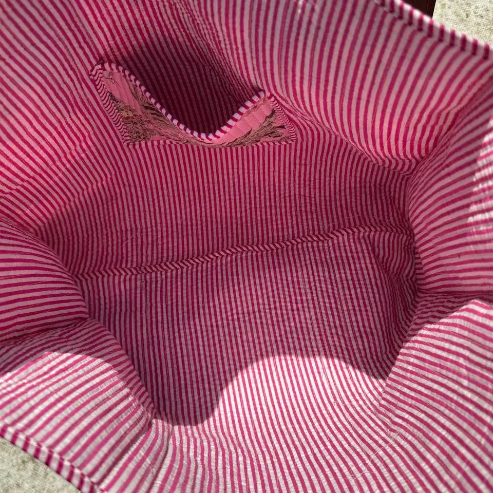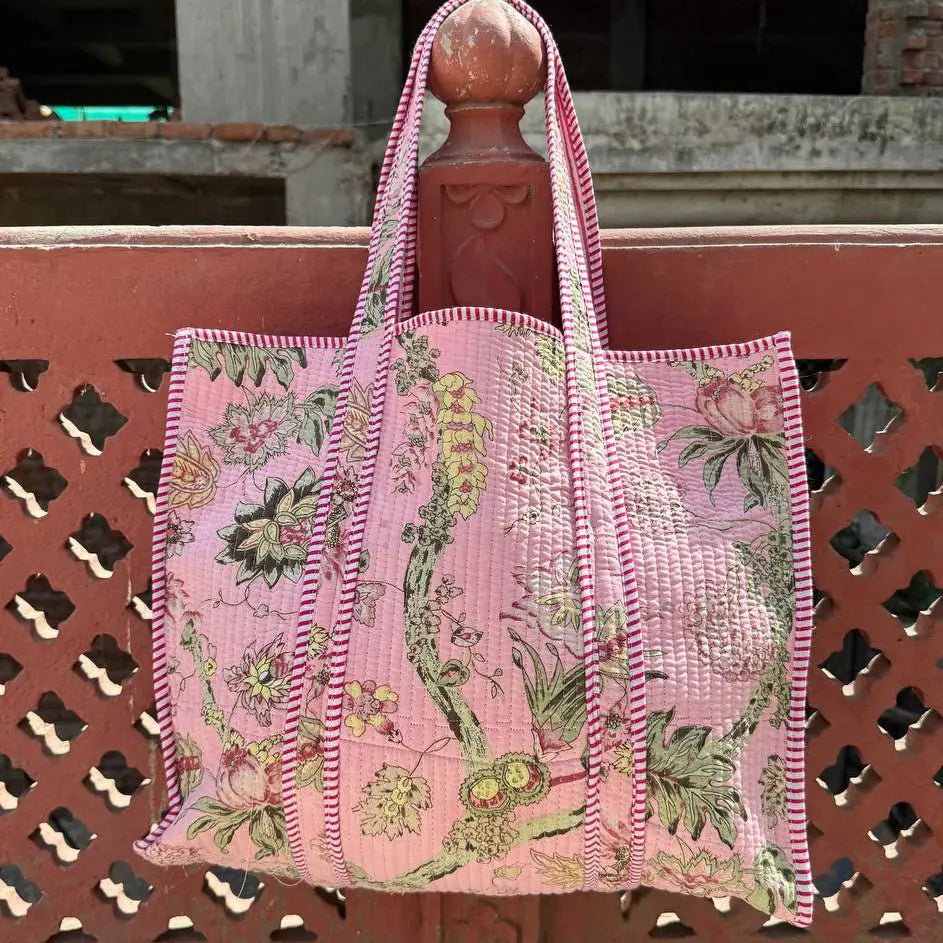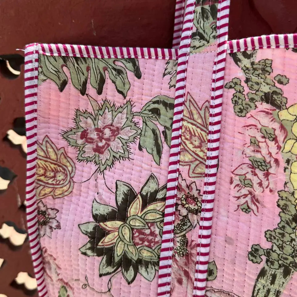 Designer Indian Printed Cotton Bags, Girls Bags, Tote Bags. The Indian Screen Printed Cotton Quilted Women's Handbags from Rajasthan India. This handbag is completely Indian printed on good quality cotton. Cotton quilted travel bag made by Indian Artisans, This cotton quilted shopping bag is totally unique and multi purpose. Use this for your grocery or as a travel bag. Perfect to suit everyone. Item :- Cotton Handbag SIZE MEASURES:: Height: 18 INCH Width: 18 INCH Handle: 11 INCH Gusset: 5.5 INCH Pocket - Inside Material: Cotton Technique: Quilted Pattern: Floral Print Style: Tote Bag Color :- As Picture Shown Wash Care :- Dry Clean.