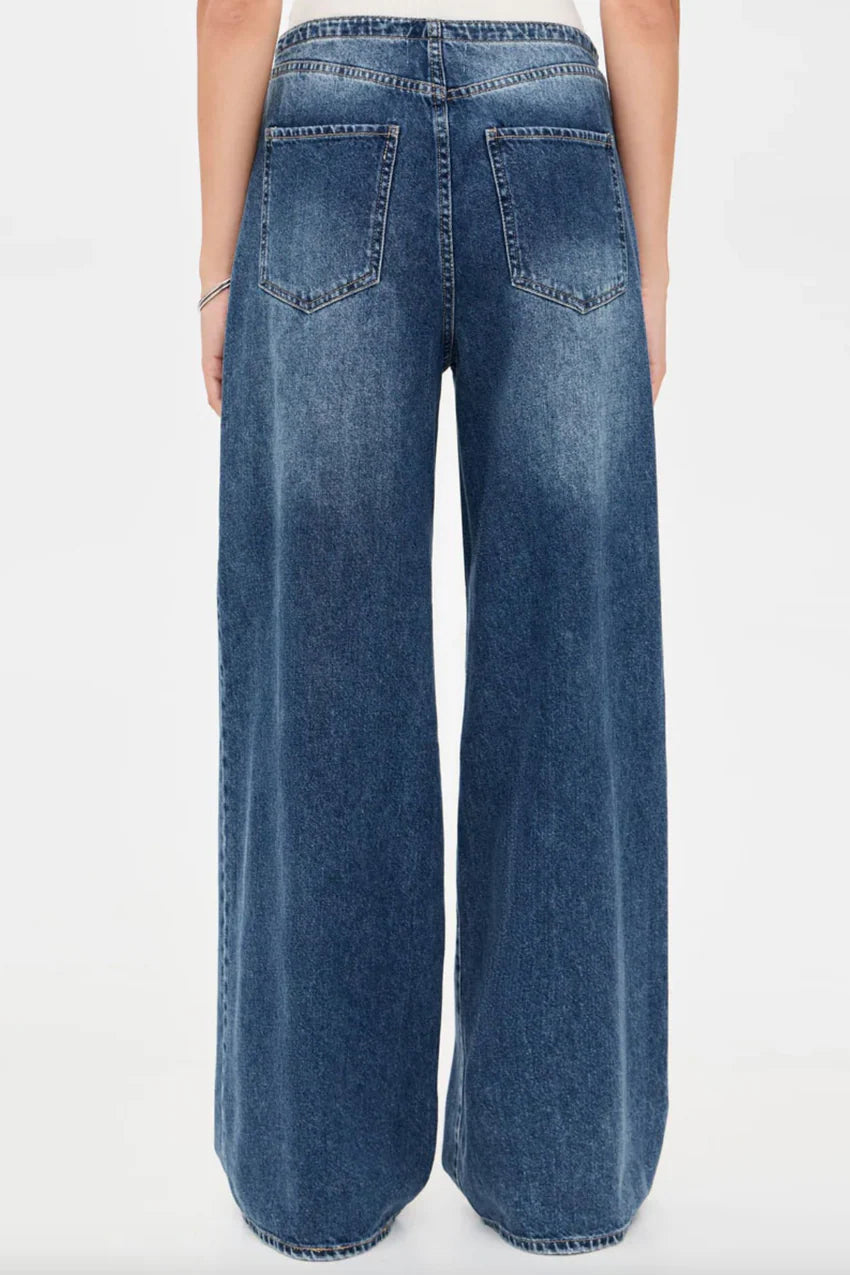 The Madison in in Vintage Blue is a mid rise wide leg jean in a timeless wash. This laid-back jean features a drawstring waist for a custom fit.