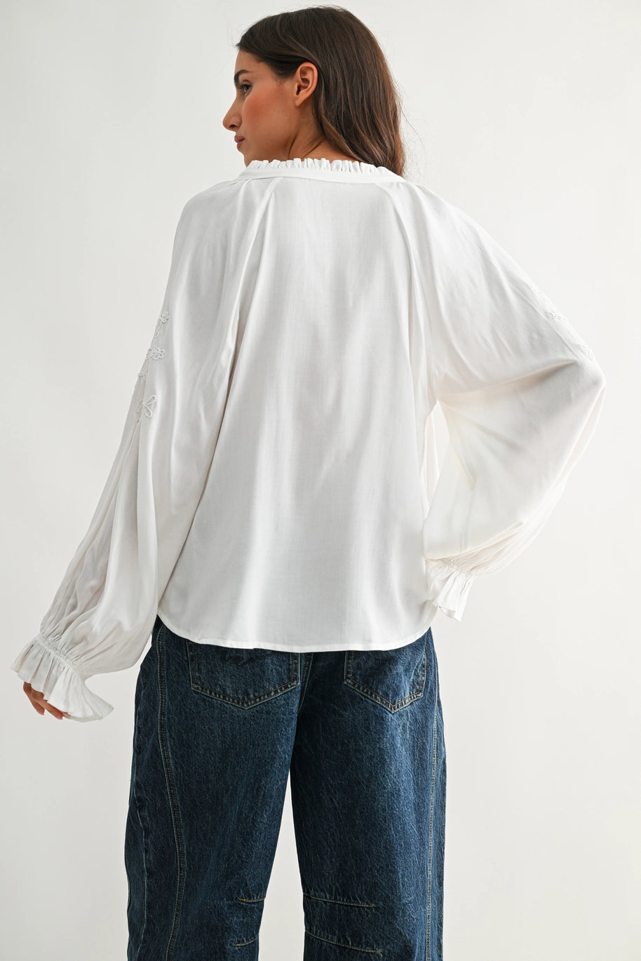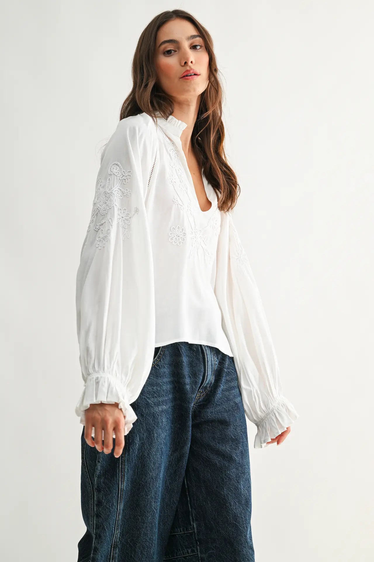 Meet the Kaylee—your new go-to blouse for looking effortlessly put-together. This white beauty combines boho charm with polished sophistication, featuring delicate tone-on-tone embroidery that dances across the front and billowing sleeves. The intricate detailing catches the light beautifully, adding visual interest without screaming for attention. Crafted from premium fabric that feels as luxe as it looks, the Kaylee transitions seamlessly from office meetings to weekend brunches. Comfortable enough for all-day wear, striking enough to turn heads—what's not to love?