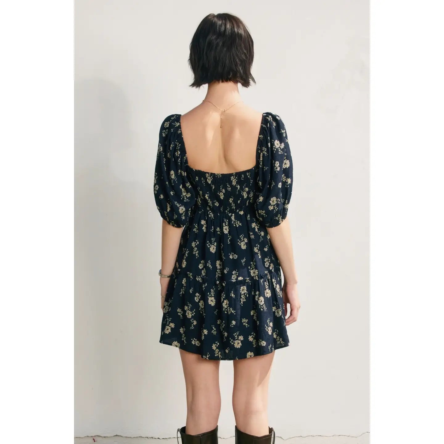 Step into sunshine with the Moonlight Floral Dress, where playful puff sleeves meet a flirty bustier bodice. The tie detail at the bust and V-neck shape add charming allure, while the tiered mini skirt delivers a fun, twirl-worthy finish. Elastic bands on the sleeves and shoulders ensure comfort, and the side zipper makes slipping in effortless. Fully lined for smooth wear, this dress is your go-to for sunny days and breezy nights.