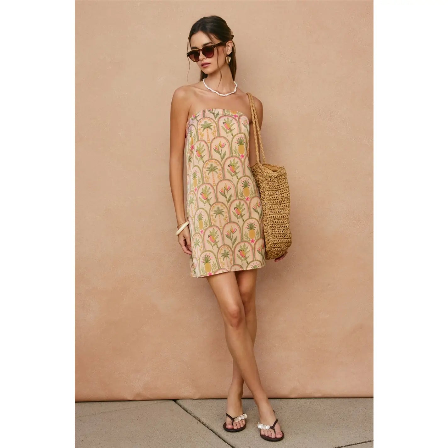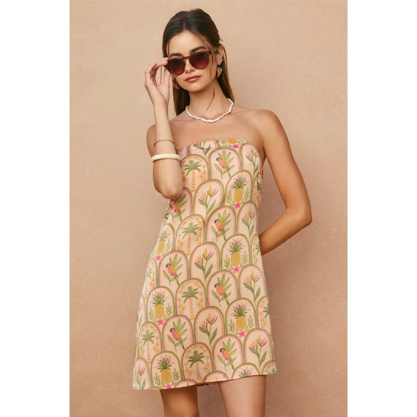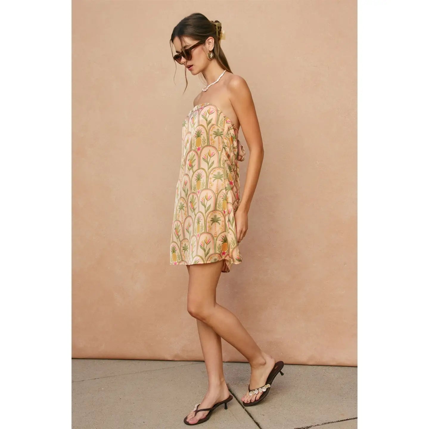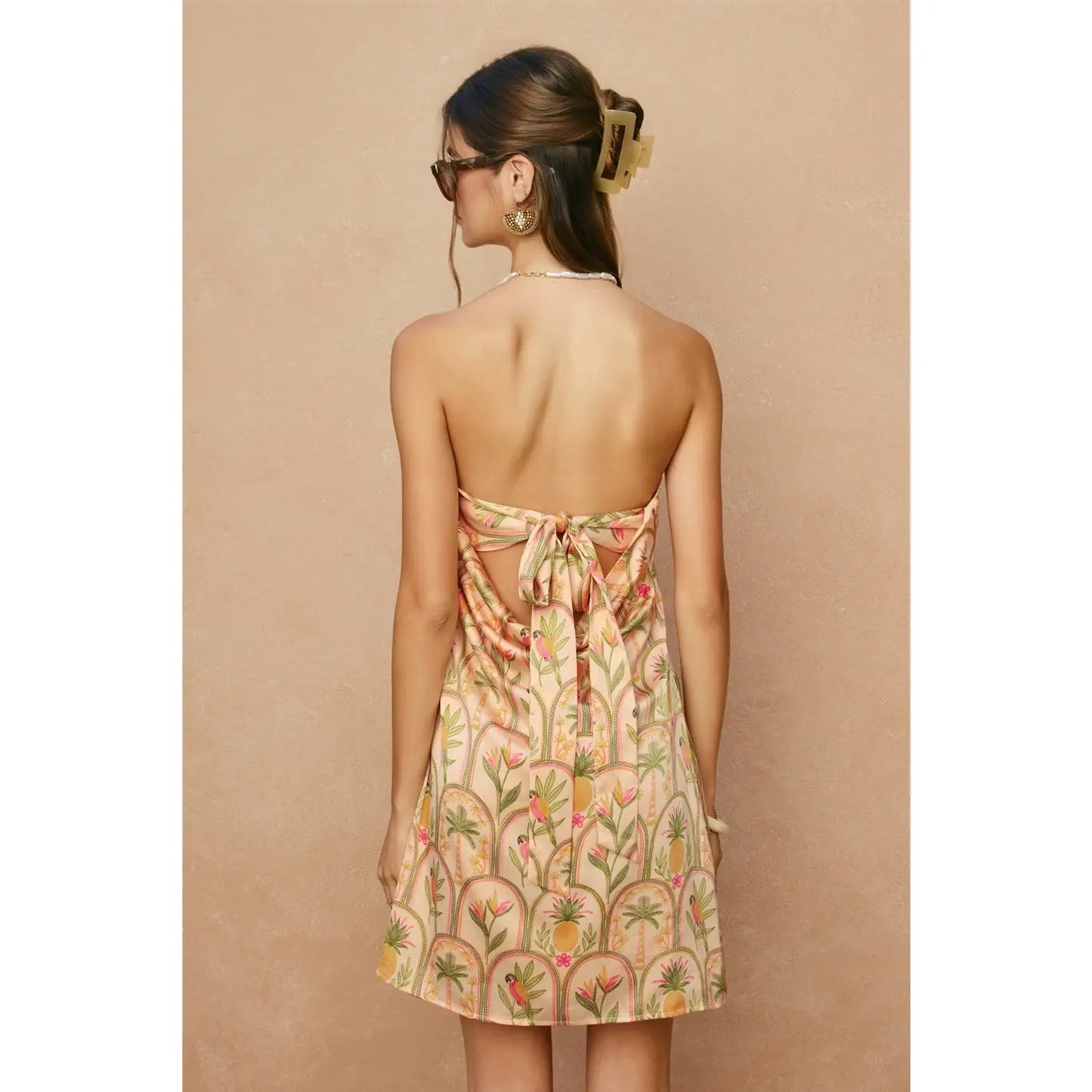 Satin tropical parrot print mini dress with back tie and cowl detail