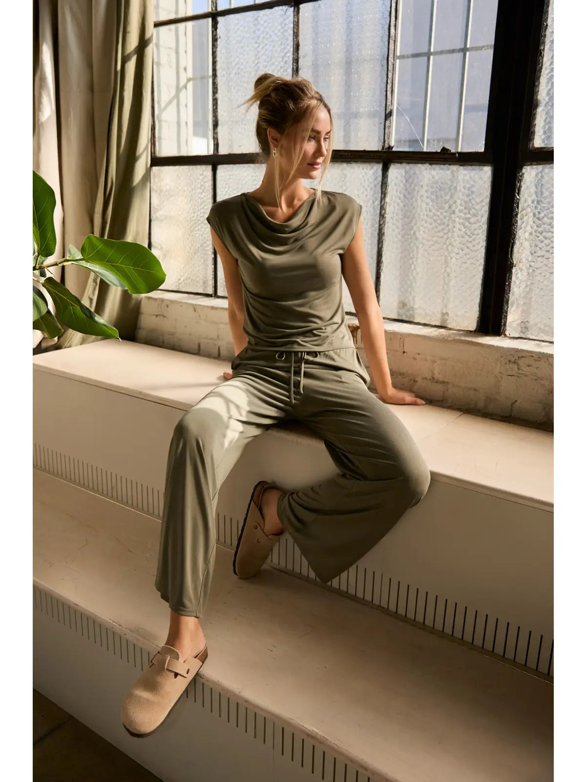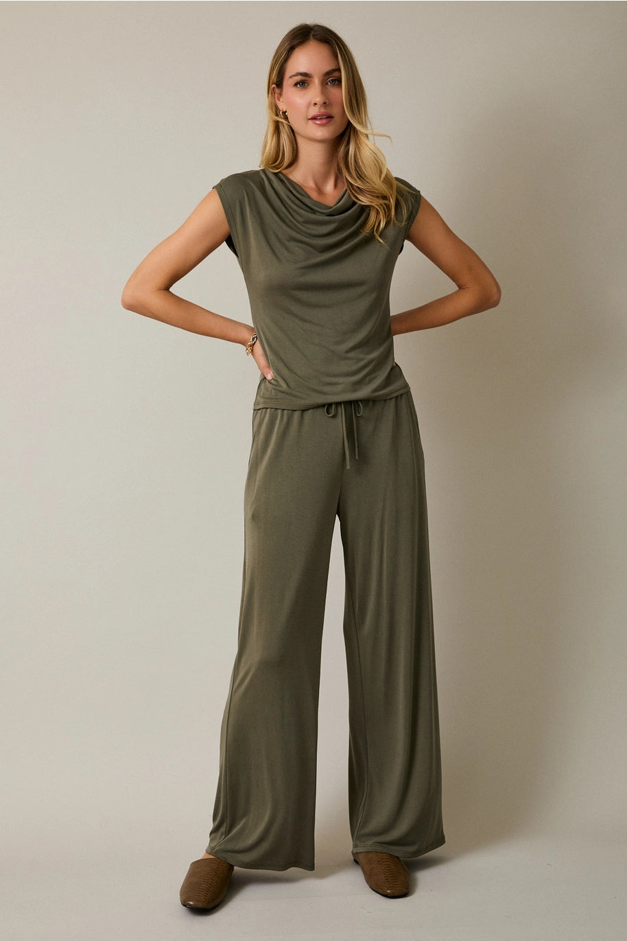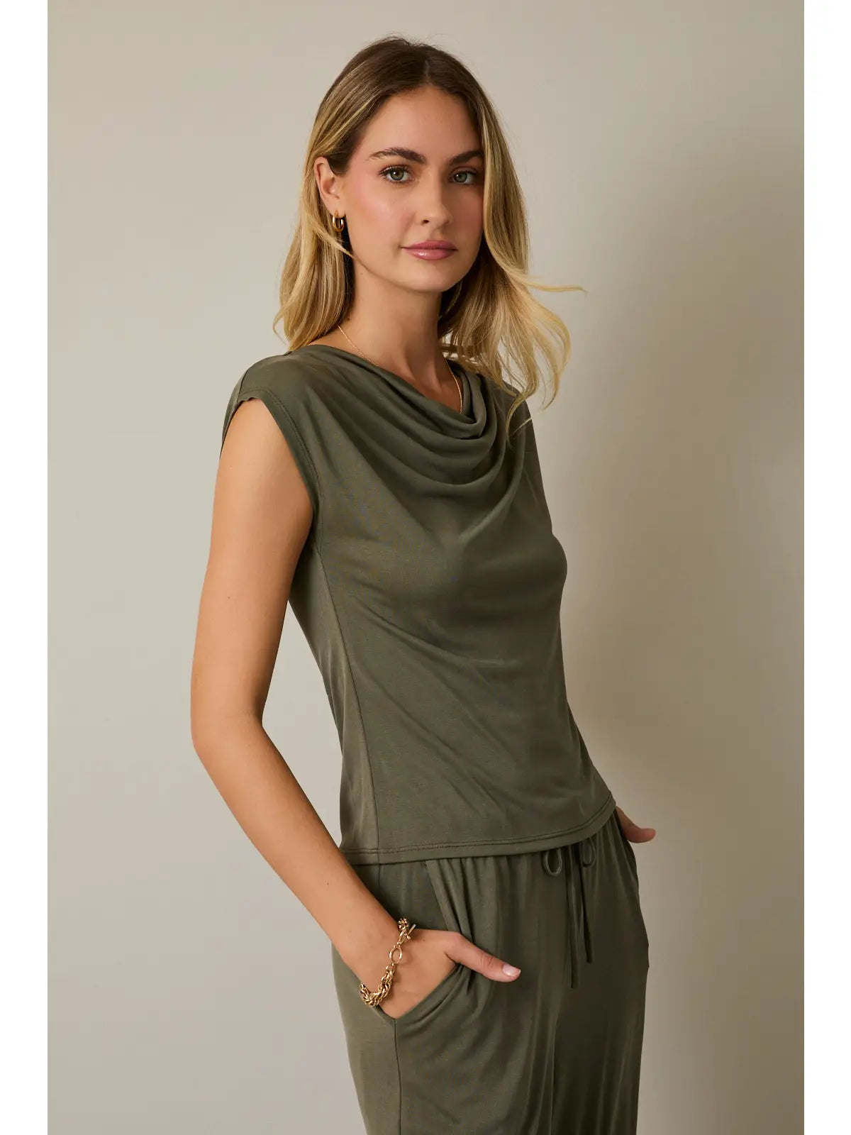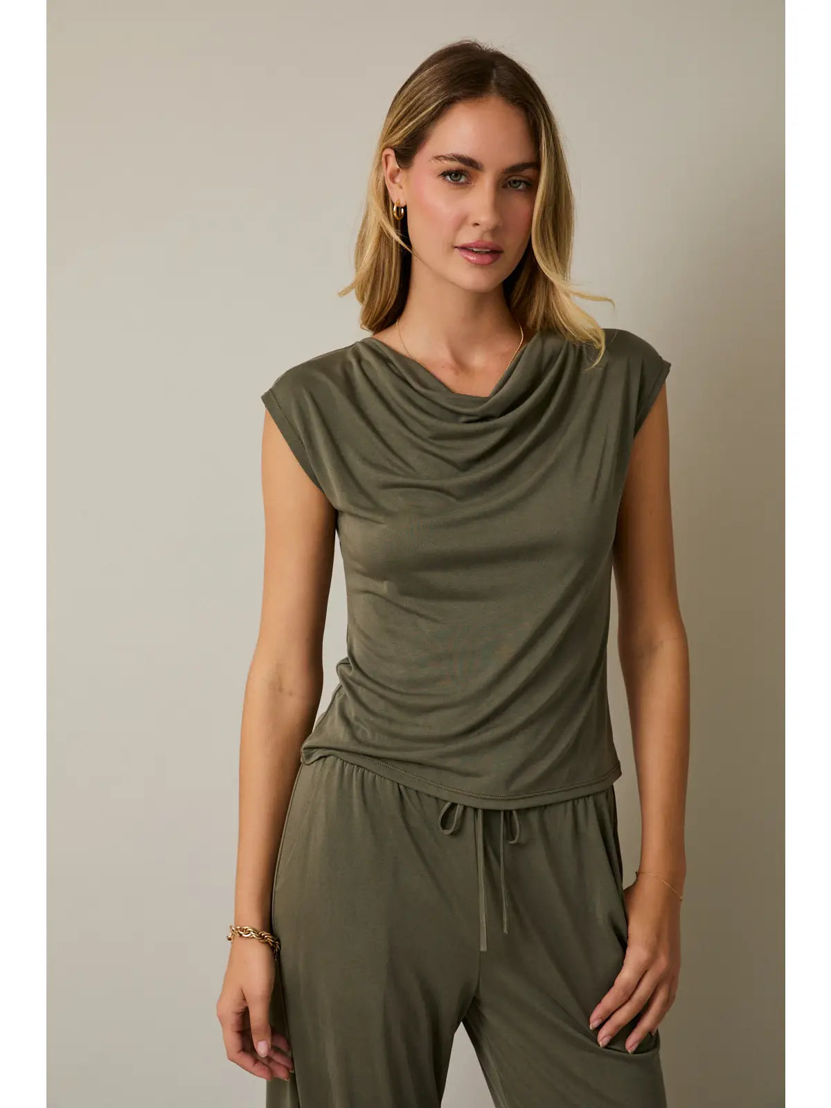 The Emma Cowl Neck Cap Sleeve Top is your new go-to piece for effortless style. Crafted from soft, luxurious fabric in a chic olive green, this top features a flattering cowl neckline and cute cap sleeves that work whether you're dressing it up for a night out or keeping it casual for everyday wear. Part of a coordinated set, it pairs perfectly with our matching Emma Draw String Wide Leg Pants (sold separately) for a polished, put-together look. Mix and match to create your ideal outfit!