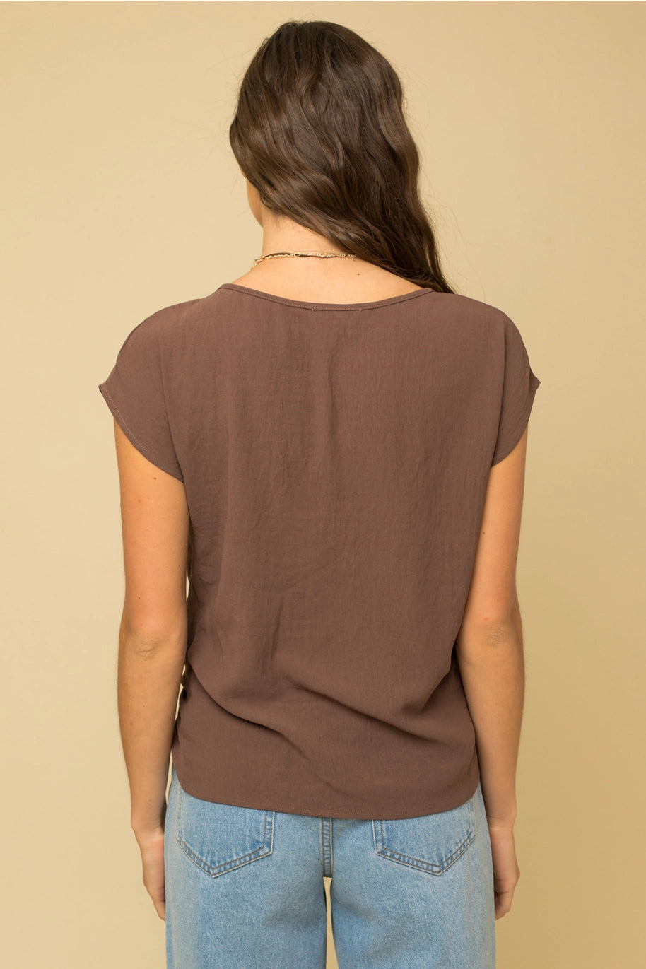 Add a fun twist to your wardrobe with this brown woven tee featuring a charming front knot detail. Its solid tone pairs easily with your favorite jeans or skirts, while the knot adds a playful flair to any casual look. Perfect for effortless style that keeps you comfortable and confident all day long.