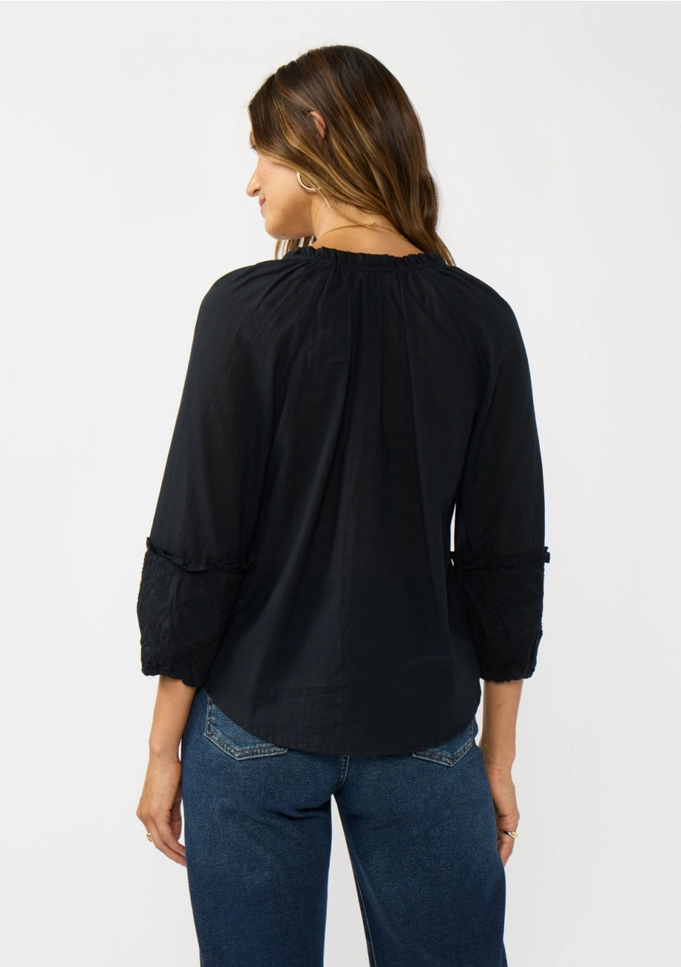 Breezy and romantic, this fall-ready 3/4 sleeve blouse is made from lightweight cotton voile and styled with a split neckline edged in delicate self ruffles and finished with slender spaghetti ties. The contrast embroidered cotton sleeve tiers are accented with soft self ruffles and elastic hems, while the flowing silhouette and neatly stitched hem create an effortlessly graceful finish.