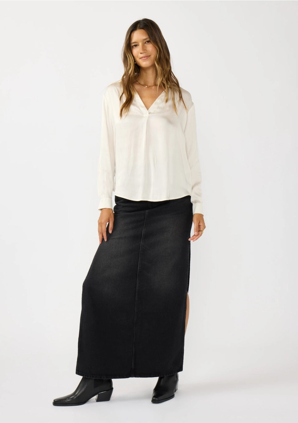 Crafted from smooth poly satin, this fall blouse exudes timeless elegance with its split neckline and crisp collar with a structured collar stand. The long sleeves are finished with a single-button closure for a tailored touch. A clean-finished hemline and subtle inside facing at the neckline enhance its polished look, making it a versatile choice for both work and evening wear.